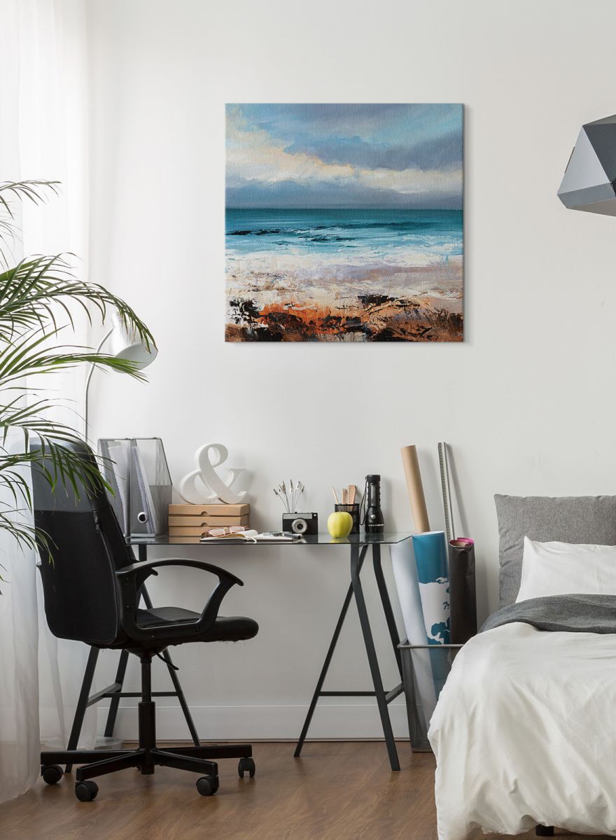 Sea Surge – obraz na płótnie Naciągnięty na sosnowe krosna. Gotowy do zawieszenia na ścianę. Wykonany z najwyższą dbałością o detale. Obraz jest ostry a barwy nasycone. Ten egzemplarz posiada zadrukowane boki, nie trzeba go dodatkowo oprawiać. Płótno bawełniane na który został naniesiony obraz jest bardzo mocne i posiada ciekawą fakturę. Blejtrama wykonana jest natomiast z grubego drzewa sosnowego. Jest solidna, jej szerokość to 3,5 cm a grubość 2 cm. Kupując ten produkt masz pewność, że kupujesz z legalnego źródła i wspierasz artystów. Obraz jest oryginalny i posiada licencję. Lubisz wyróżniać się ciekawymi, ekskluzywnymi dekoracjami na ścianę? Ten obraz jest idealny dla Ciebie. Nikt nie przejdzie obojętnie obok niego, jest po prostu piękny. Dane techniczne: Płótno bawełniane 300g/m2. Sosnowe krosna o grubości 2 cm i szerokości 3,5 cm. Obraz zadrukowany cyfrowo. Wymiary obrazu 85×85 cm. Marka: Pyramid Posters.