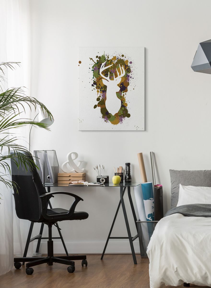 Splatter Silhouette Stag- obraz na płótnie Naciągnięty na sosnowe krosna. Gotowy do zawieszenia na ścianę. Wykonany z najwyższą dbałością o detale. Obraz jest ostry a barwy nasycone. Ten egzemplarz posiada zadrukowane boki, nie trzeba go dodatkowo oprawiać. Płótno bawełniane na który został naniesiony obraz jest bardzo mocne i posiada ciekawą fakturę. Blejtrama wykonana jest natomiast z grubego drzewa sosnowego. Jest solidna, jej szerokość to 3,5 cm a grubość 2 cm. Kupując ten produkt masz pewność, że kupujesz z legalnego źródła i wspierasz artystów. Obraz jest oryginalny i posiada licencję. Lubisz wyróżniać się ciekawymi, ekskluzywnymi dekoracjami na ścianę? Ten obraz jest idealny dla Ciebie. Nikt nie przejdzie obojętnie obok niego, jest po prostu piękny. Dane techniczne Płótno bawełniane 300g/m2 Sosnowe krosnao grubości 2 cm i szerokości 3,5 cm Obraz zadrukowany cyfrowo Wymiary obrazu 40×50 cm