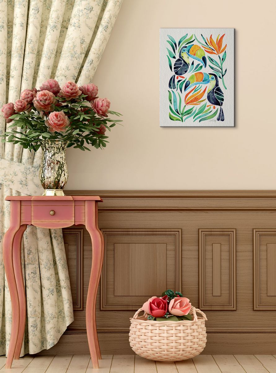 Tropical Toucans – Obraz na płótnie naciągnięty na sosnowe krosna. Gotowy do zawieszenia na ścianę. Wykonany z najwyższą dbałością o detale.Obraz jest ostry a barwy nasycone. Ten egzemplarz posiada zadrukowane boki, nie trzeba go dodatkowo oprawiać. Płótno bawełniane na który został naniesiony obraz jest bardzo mocne i posiada ciekawą fakturę. Blejtrama wykonana jest natomiast z grubego drzewa sosnowego. Jest solidna, jej szerokość to 3,5 cm a grubość 2 cm. Kupując ten produkt masz pewność, że kupujesz z legalnego źródła i wspierasz artystów. Obraz jest oryginalny i posiada licencję. Lubisz wyróżniać się ciekawymi, ekskluzywnymi dekoracjami na ścianę ? Ten obraz jest idealny dla Ciebie. Nikt nie przejdzie obojętnie obok niego, jest po prostu piękny. Dane techniczne Płótno bawełniane 300g/m2 Sosnowe krosnao grubości 2 cm i szerokości 3,5 cm Obraz zadrukowany cyfrowo Wymiary obrazu 30×40 cm