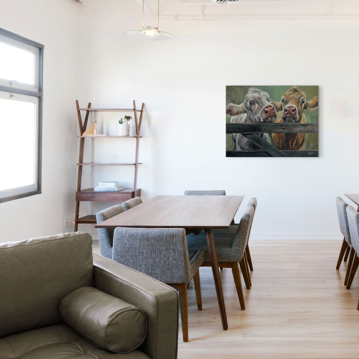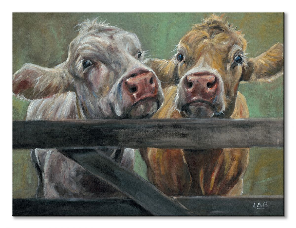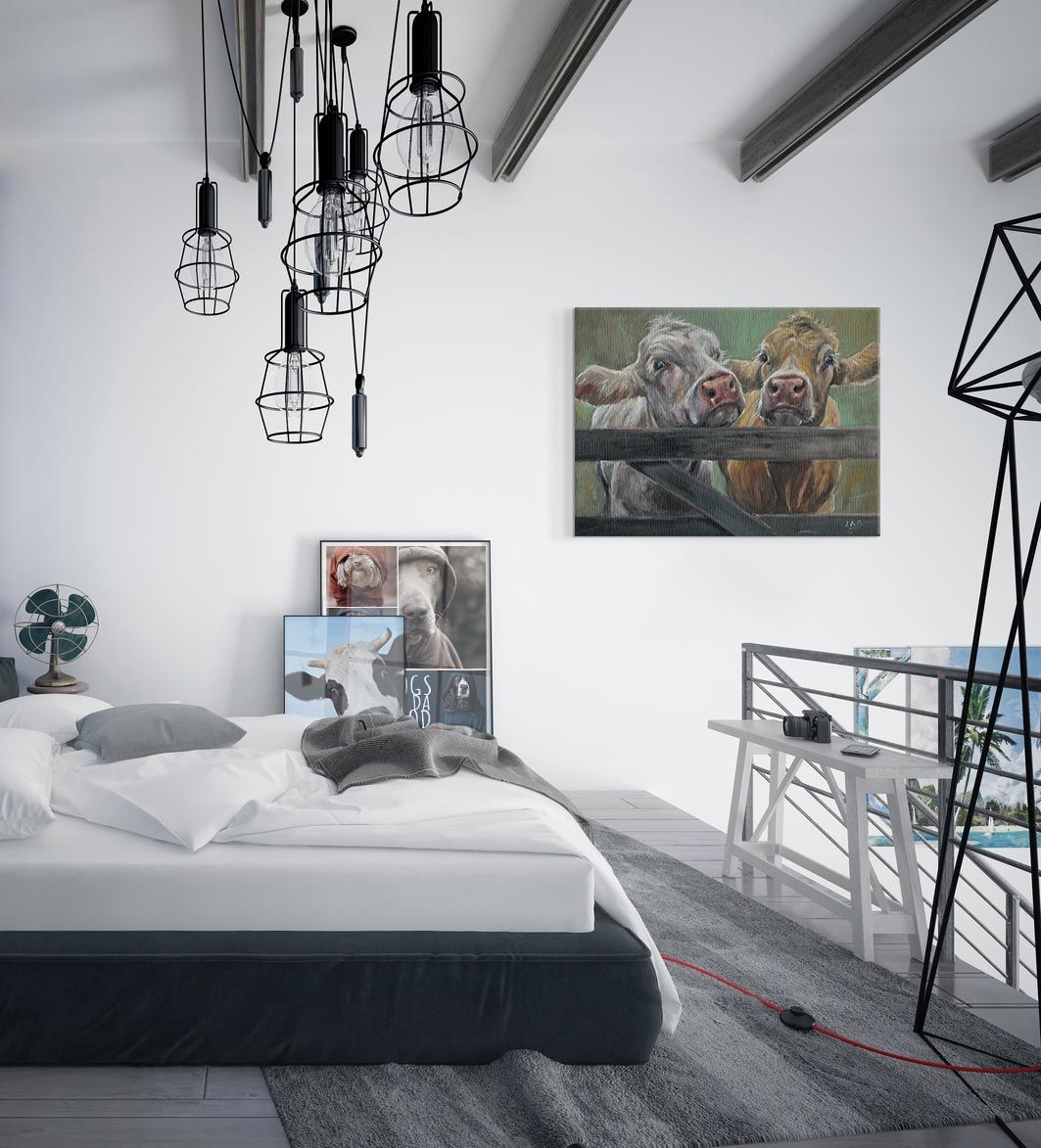 Two Moos- obraz na płótnie Naciągnięty na sosnowe krosna. Gotowy do zawieszenia na ścianę. Wykonany z najwyższą dbałością o detale. Obraz jest ostry a barwy nasycone. Ten egzemplarz posiada zadrukowane boki, nie trzeba go dodatkowo oprawiać. Płótno bawełniane na który został naniesiony obraz jest bardzo mocne i posiada ciekawą fakturę. Blejtrama wykonana jest natomiast z grubego drzewa sosnowego. Jest solidna, jej szerokość to 3,5 cm a grubość 2 cm. Kupując ten produkt masz pewność, że kupujesz z legalnego źródła i wspierasz artystów. Obraz jest oryginalny i posiada licencję. Lubisz wyróżniać się ciekawymi, ekskluzywnymi dekoracjami na ścianę? Ten obraz jest idealny dla Ciebie. Nikt nie przejdzie obojętnie obok niego, jest po prostu piękny. Dane techniczne Płótno bawełniane 300g/m2 Sosnowe krosnao grubości 2 cm i szerokości 3,5 cm Obraz zadrukowany cyfrowo Wymiary obrazu 80×60 cm